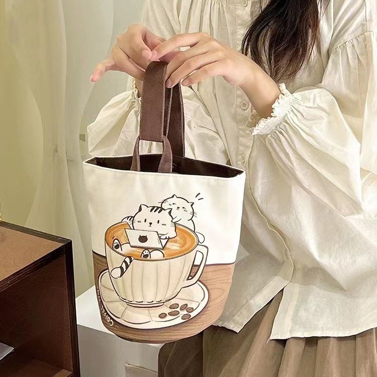 Cute Coffee Cat Portable Mummy Canvas Bag Shopping Student Cute Bucket Hand Lunch Box Handbag for Women