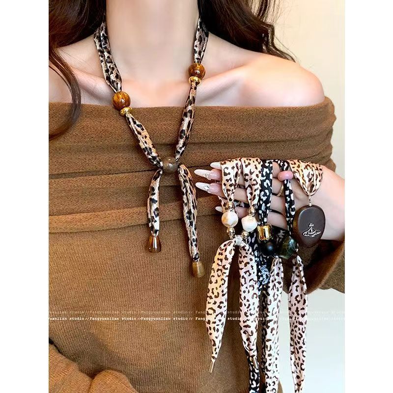 Leopard Print Beaded Silk Scarf Necklace for Women 2025 New Popular Niche Design Fashionable Wear Accessories with Exquisite Elegant