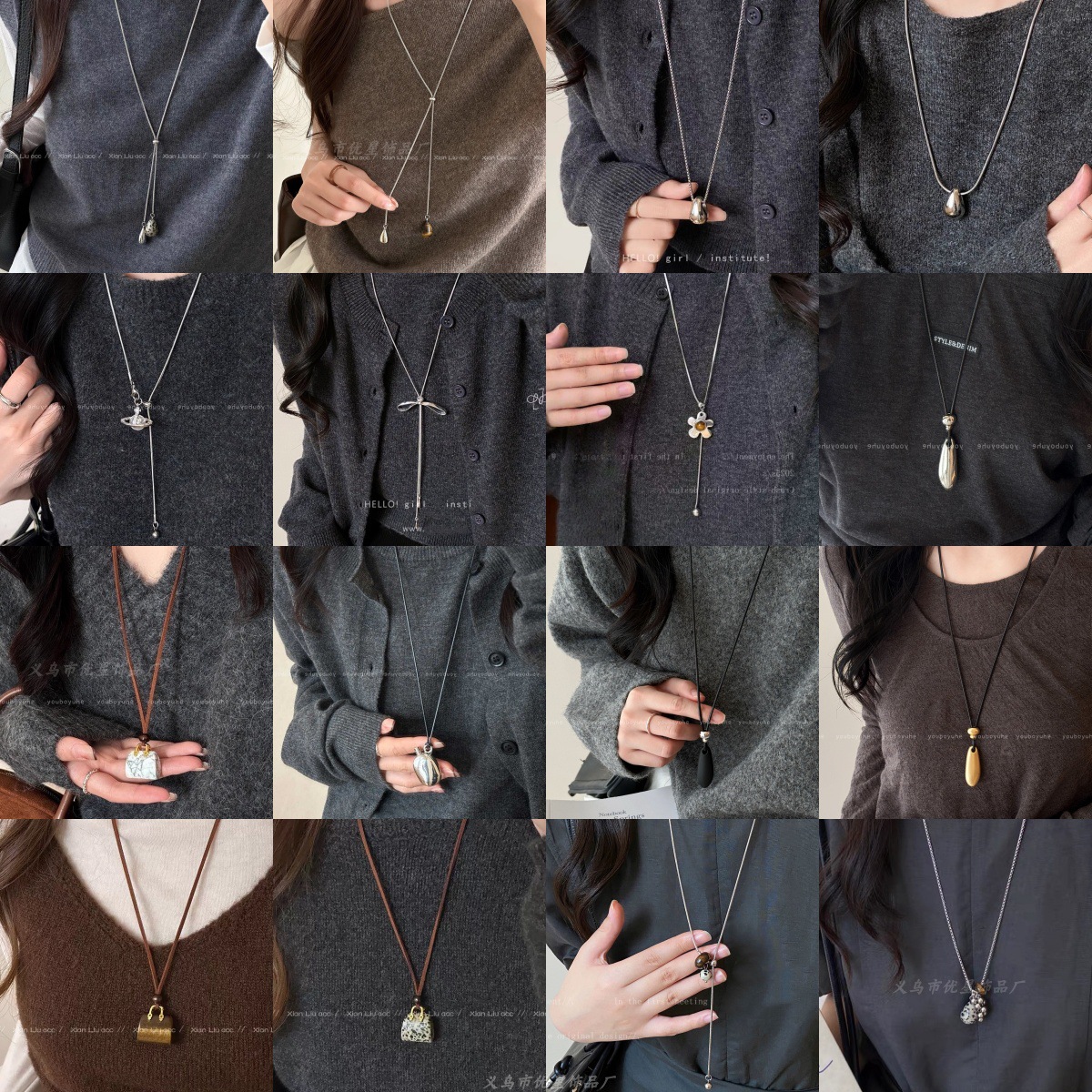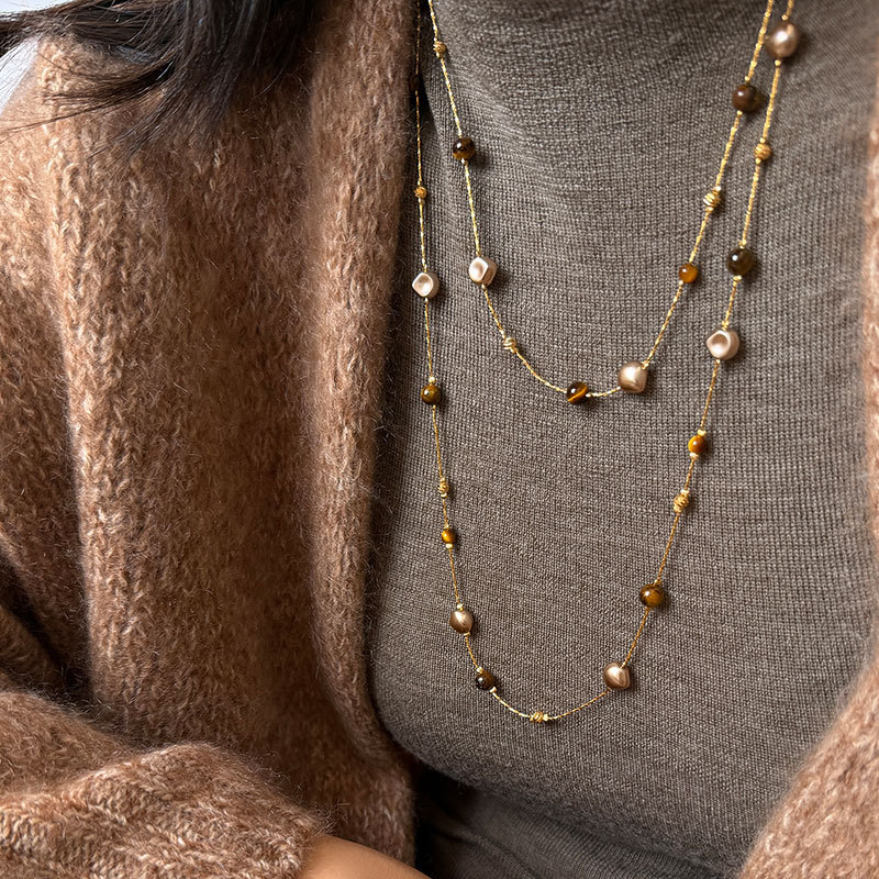 Autumn and Winter Maillard Tiger Eye Stone Pearl Long Necklace Women's Retro High Fashion Trendy Versatile Necklace Sweater Chain