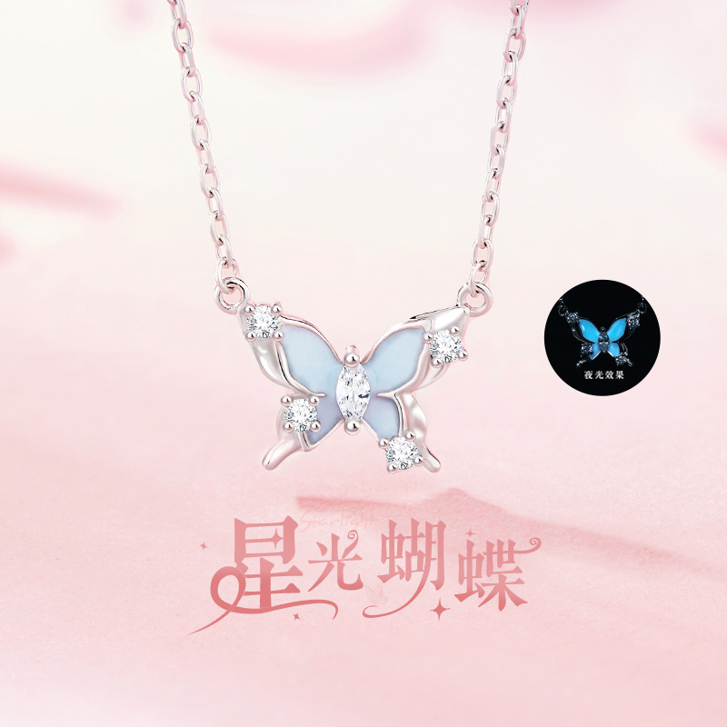 S925 Silver Starlight Butterfly Necklace Girls Entry Luxury Luminous Enamel Pendant Niche Design High-grade Clavicle Chain Gift