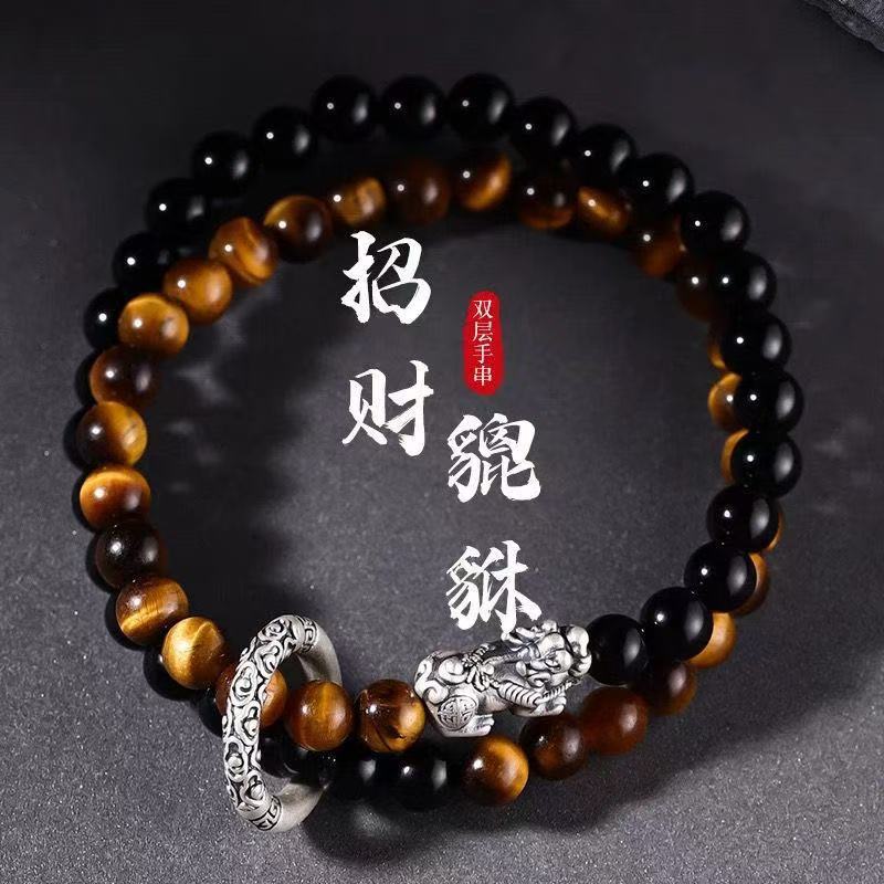 Alloy Obsidian Double Circle Bracelet New Chinese Style Zodiac Year Safety Buckle Pixiu Bracelet Men's Gift