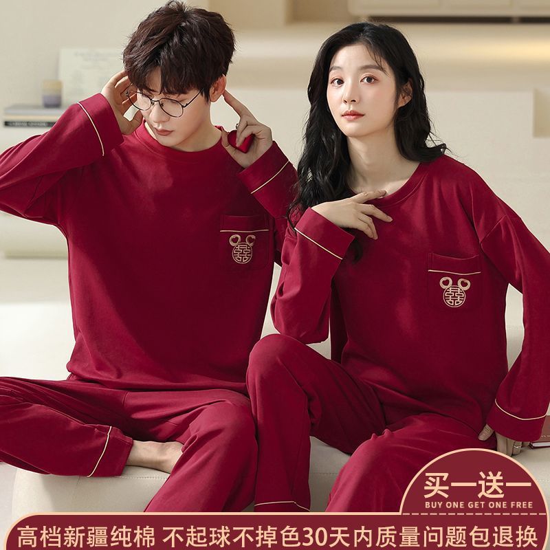 Groom and Bride Wedding Pajamas Couple Autumn and Winter Pure Cotton Newlyweds Red Home Clothes Men and Women Suits Spring & Fall