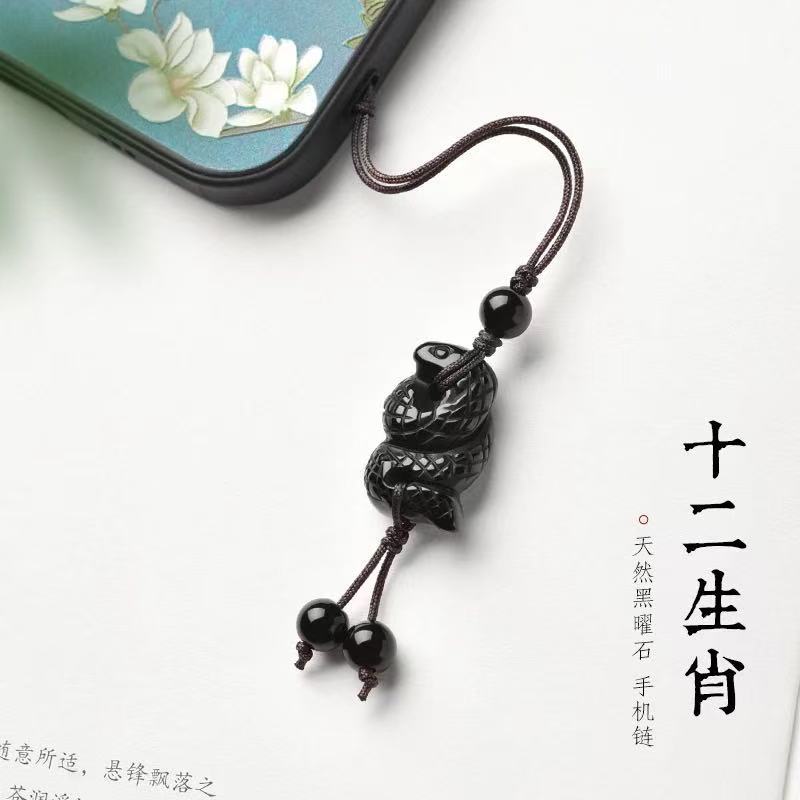 [Chinese Zodiac Year of Birth] Natural Obsidian Three-Dimensional Zodiac Mobile Phone Chain Bag Hanging Keychain for Men and Women