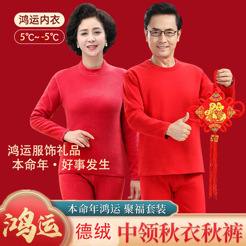 Middle-Aged and Elderly Women's Autumn Clothing and Pants Set, German Velvet Fleece-Lined and Thickeneded Men's Red Thermal Intimates Set