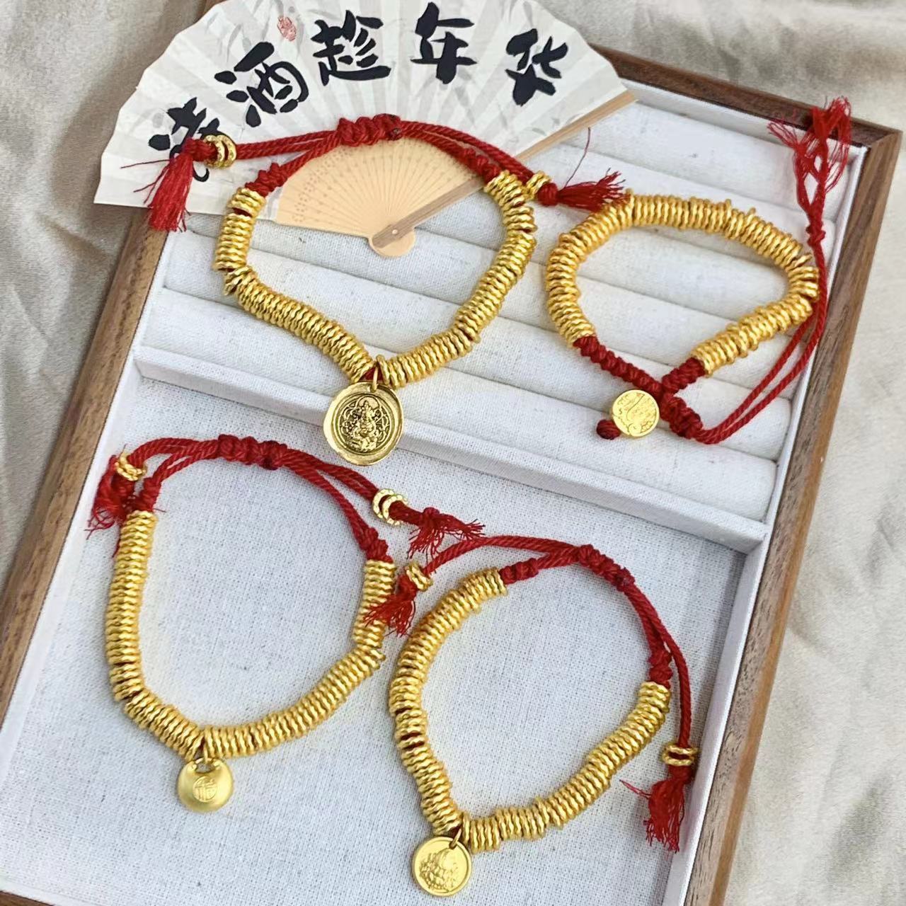New Chinoiserie Coiled Bracelet, Golden Yellow God of Wealth Round Plate, Red Rope Bracelet, Exquisite Money Hanging Pattern Gold Lock, Men's and Women's Hand Accessories