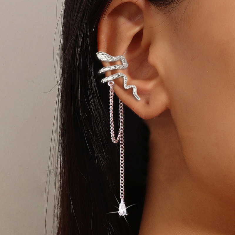 Winding Serpentine Long Ear Clip No Ear Holes Cool Shuai Water Drops Zircon Tassel Chain Fake Earrings Small Snake Ear Bone Clip Men