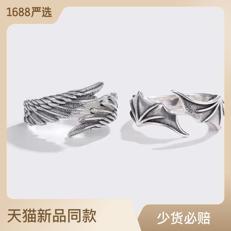 Angel and devil wings couple Thai silver ring European and American cross-border jewelry personalized open ring factory direct supply