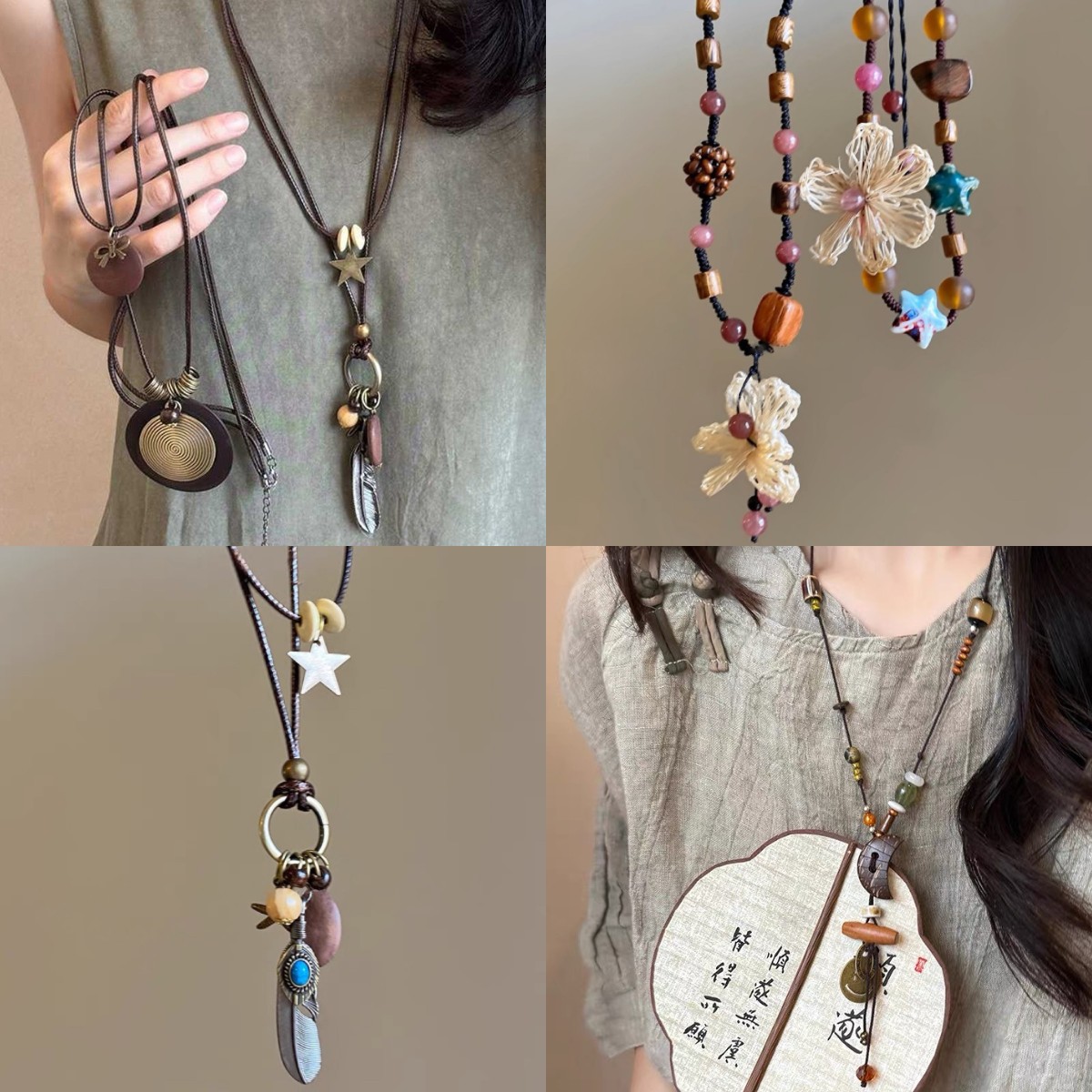 New Chinese Zen Wooden Bead Necklace Vintage Niche Stacked Woolen Chain Mori Style Bohemian Ethnic Style Necklace for Women