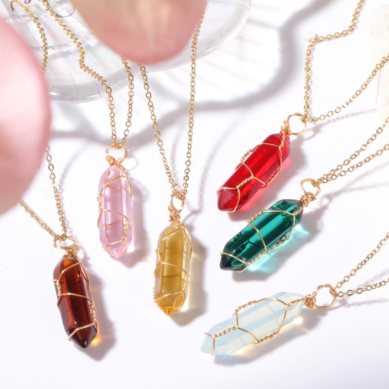 Amazon new copper wire wound Red Crystal hexagonal prism pendant necklace foreign trade energy crystal pendant