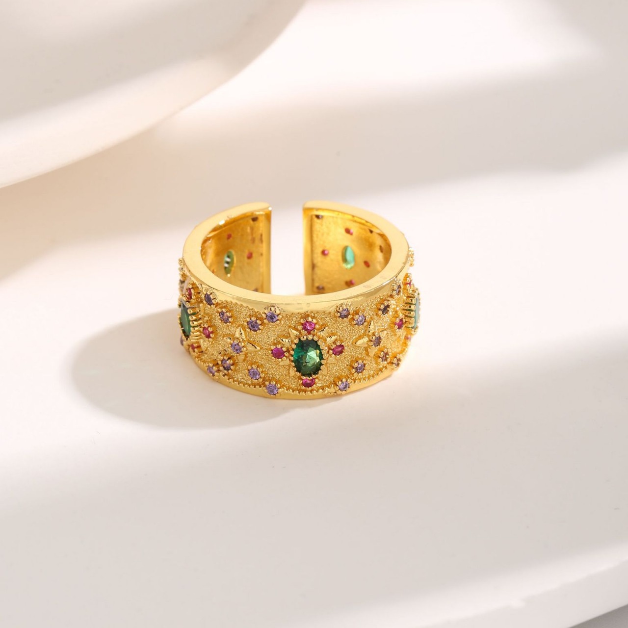 Fashion Luxury Italian Craft Textured Carved Gold Palace Wind Mang Star Emerald Color Diamond Zircon Ring Live