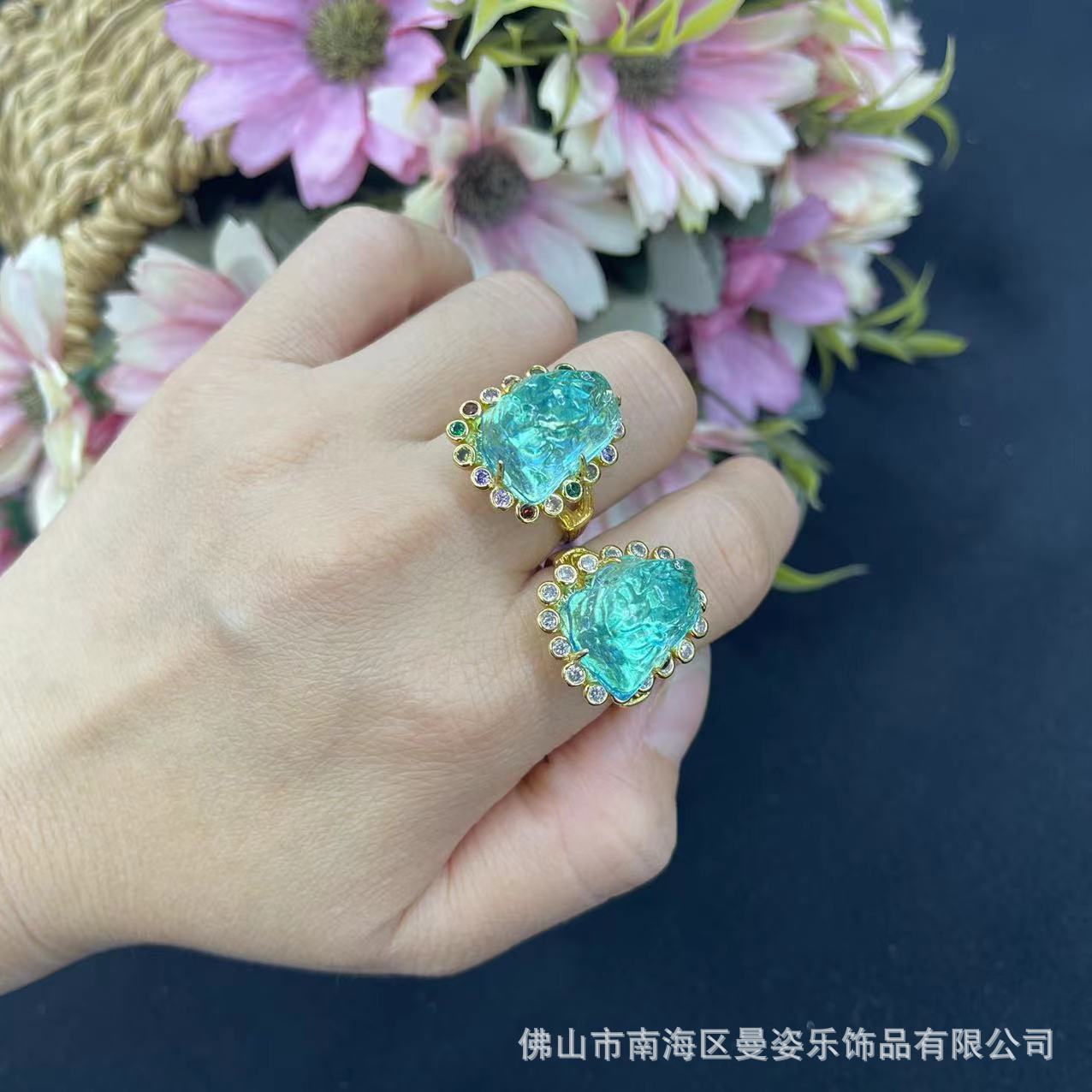 New color gem inlaid second generation aquamarine jewelry exquisite open mouth color retaining ring niche high-end jewelry wholesale
