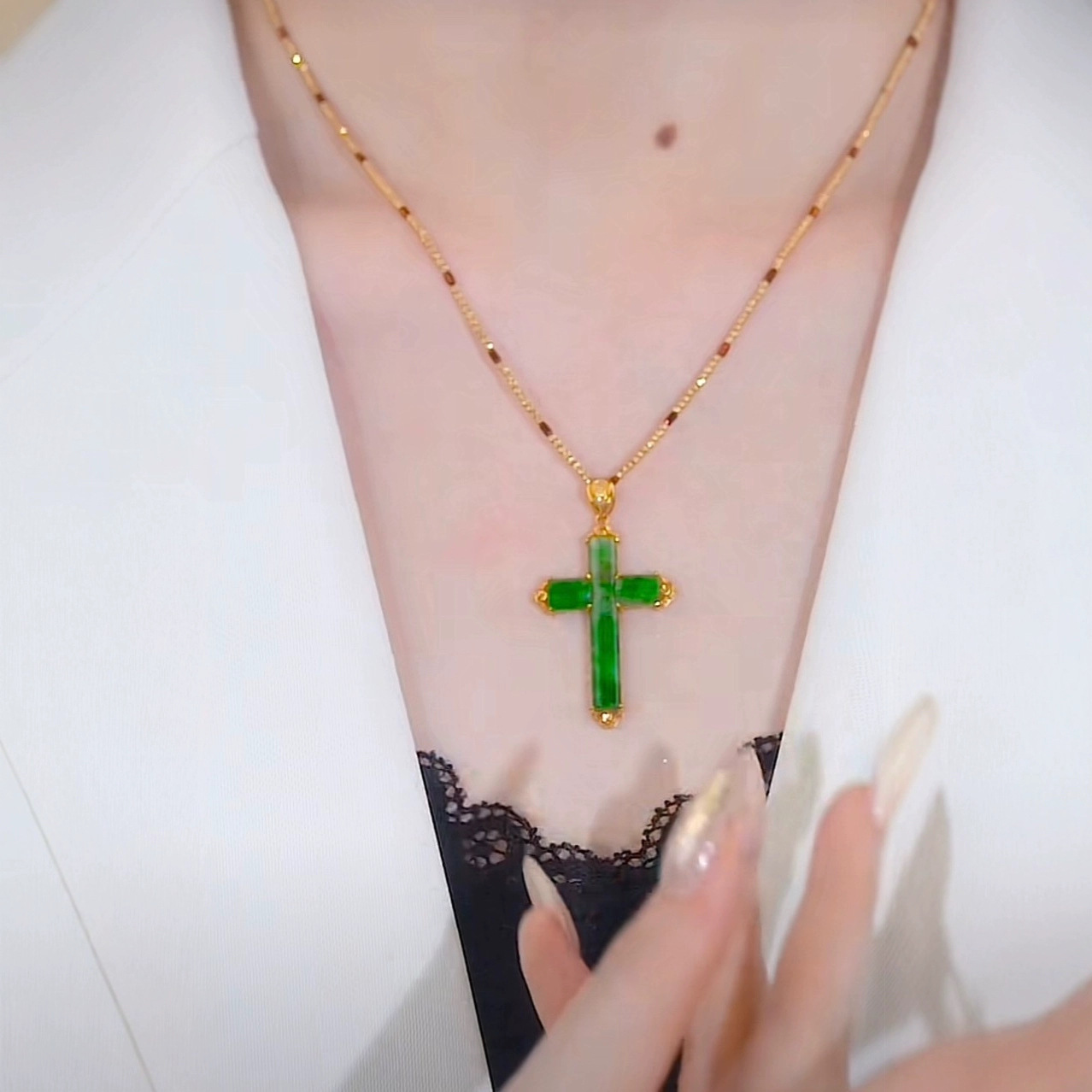 New Amulet Imitation Jade Cross Diamond Pendant Green Gold-plated Necklace Clothing Pendant