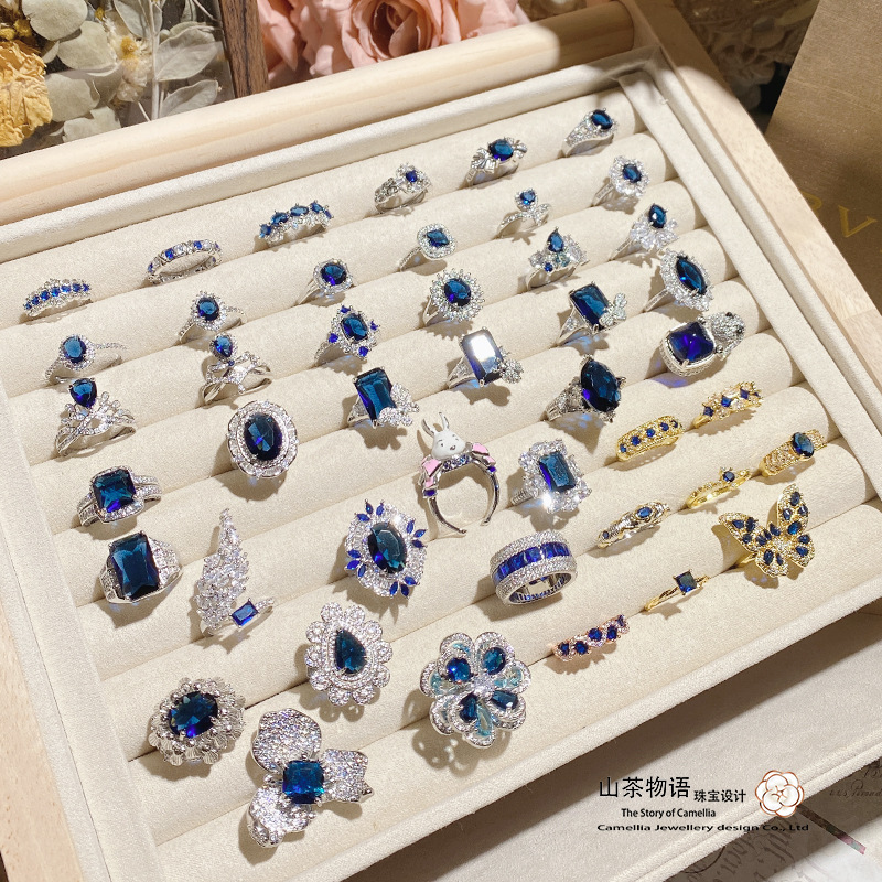 Camellia Gaoding jewelry design blue corundum color treasure ring French luxury advanced imitation natural diopside ring