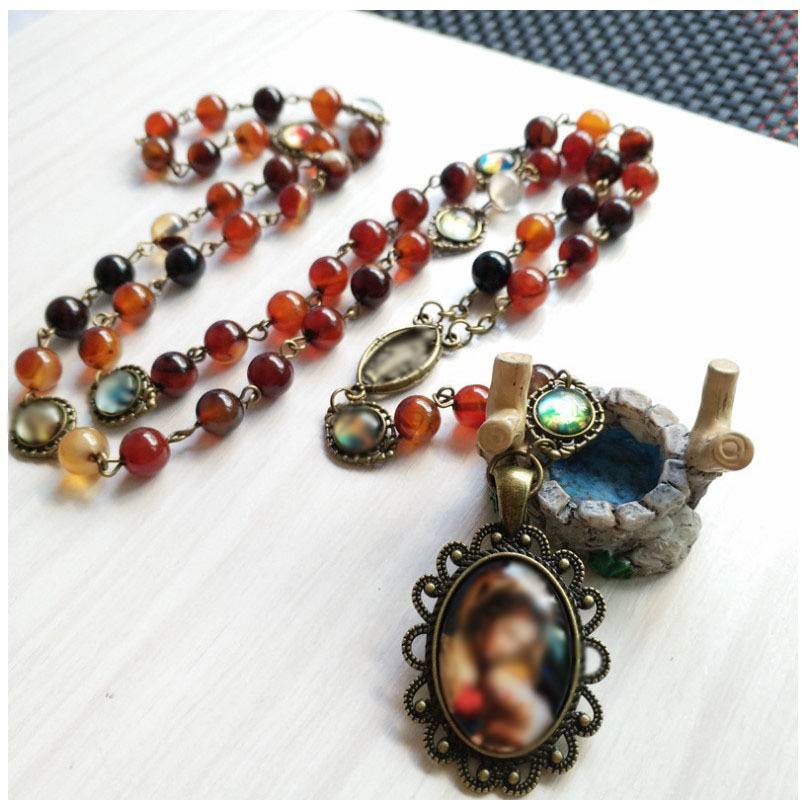 Foreign trade jewelry retro fantasy agate stone round beads trendy seven bitter rosary men and women all-match glass pendant necklace