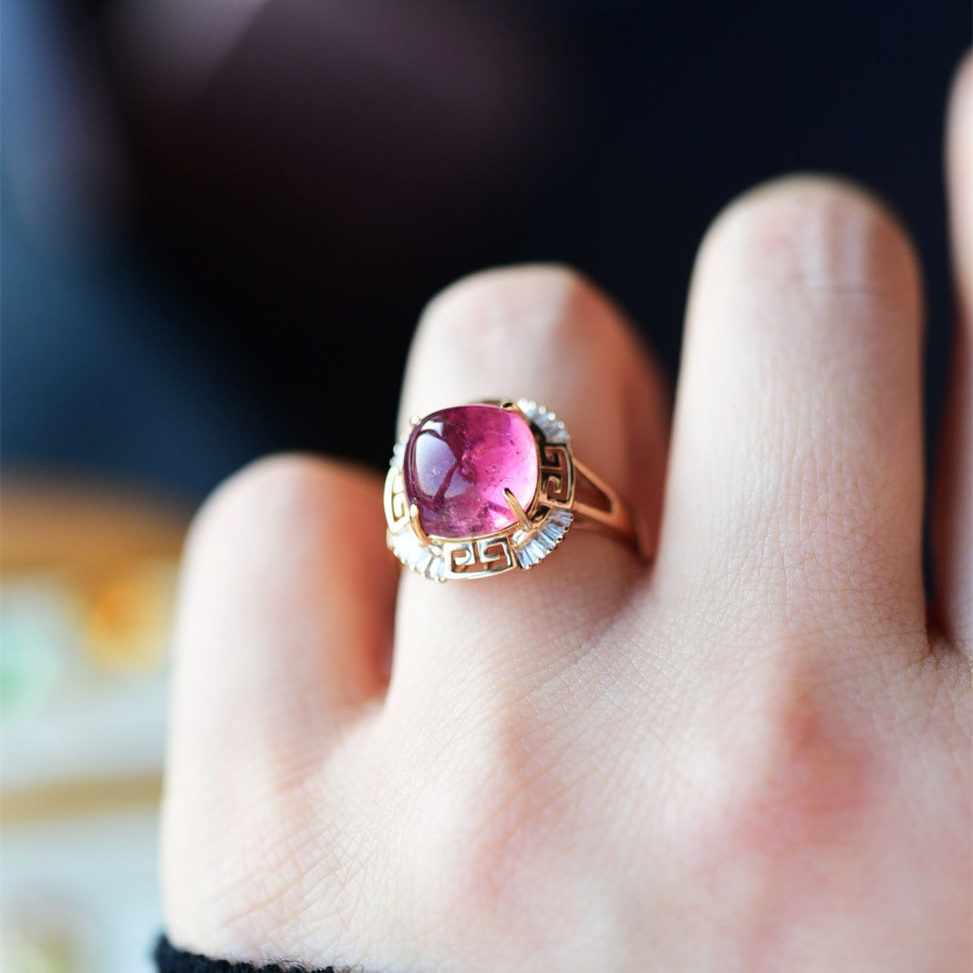 [Rose] New imitation powder tourmaline ring full thick 925 silver inlaid palace style high sense