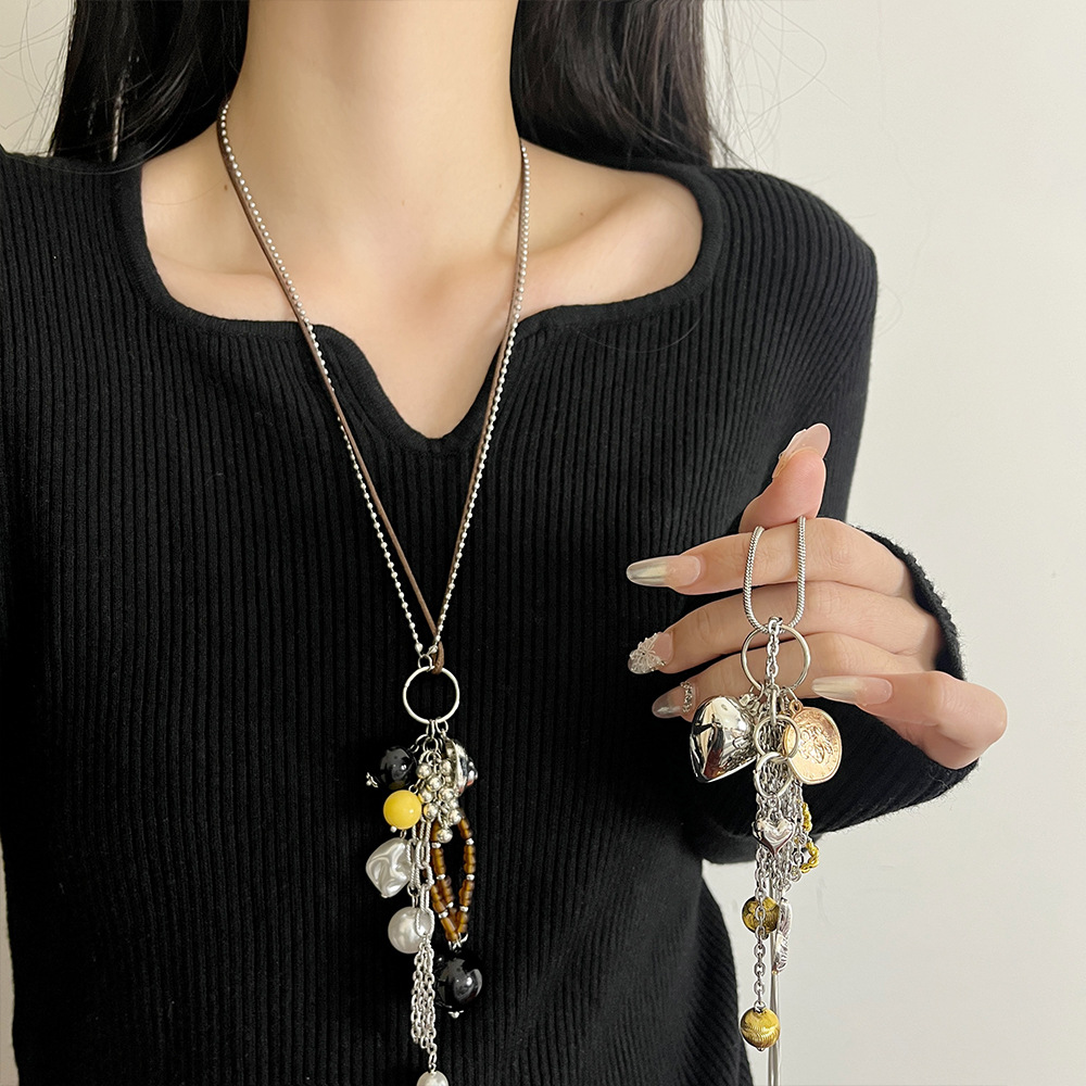 Multi-element Love Tassel Necklace Women's Gold and Silver Color Contrast Retro Fashionable Sweater Chain Autumn and Winter Niche Long Sweater Chain
