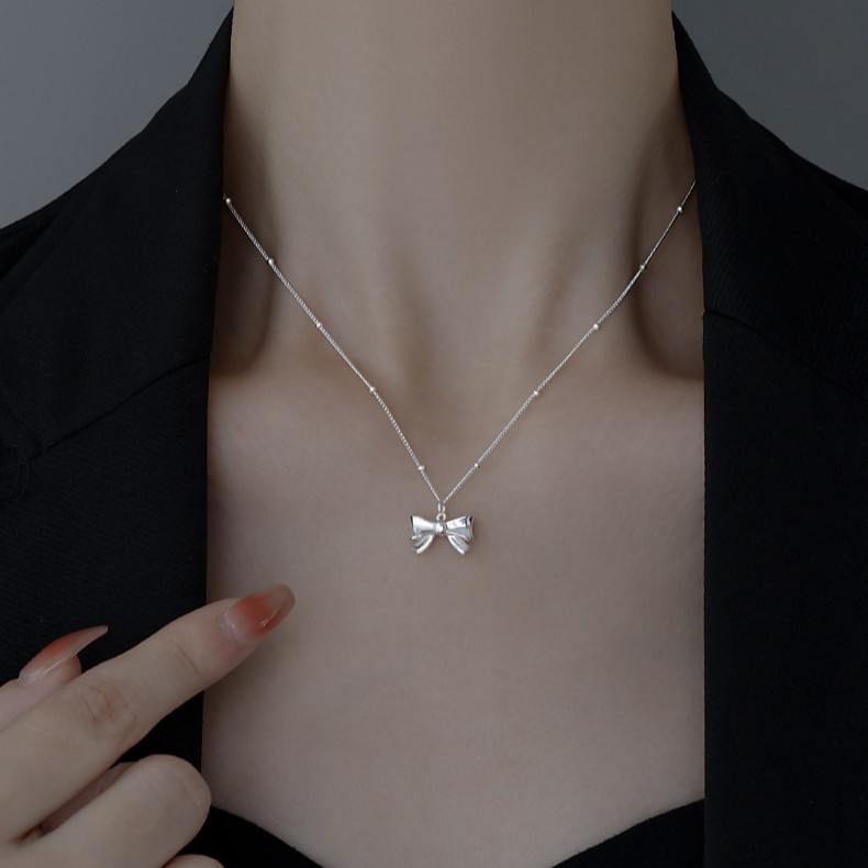 925 Silver Plated Bow Pendant Necklace Sweatshirt Sweater Chain Suitable for Girls in Winter Clavicle Chain Elegant Necklace