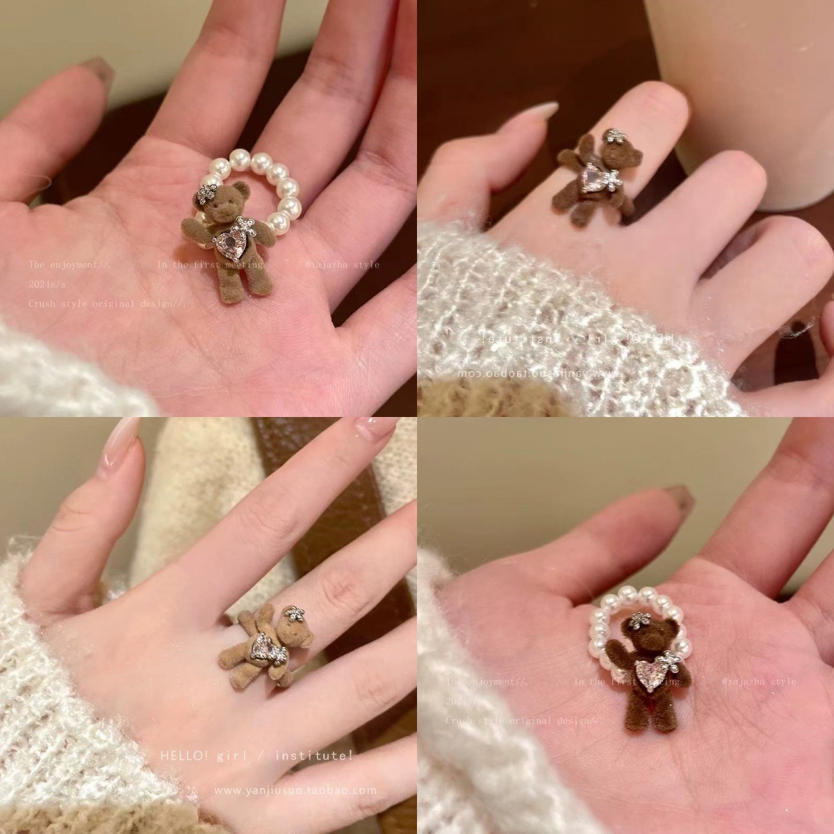 Cartoon Flocked Bear Pearl Ring Cute Girly Versatile Fashion Personality Winter Snowflake Index Finger Ring