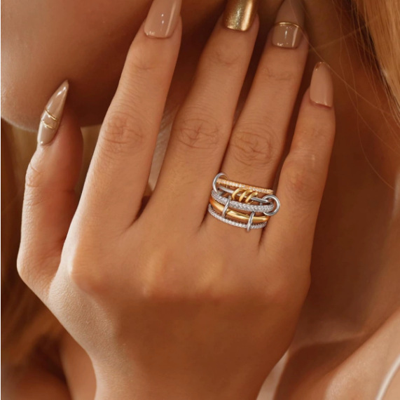 Cross-Border Hot-Selling New Product Five-Ring Stacked Cubic Zirconia 18K Gold Copper Thick High-Gloss Double Ring