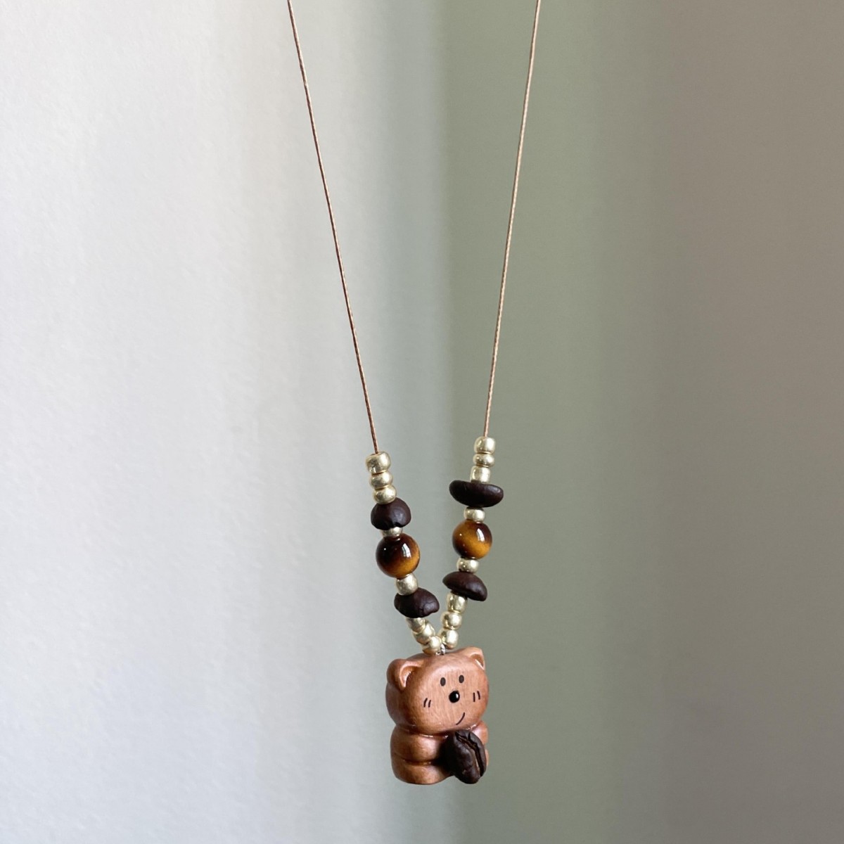 Cute Wooden Coffee Bear Pendant Necklace for Women, Retro Niche Design Sweater Chain, Daily Accessories Sweatshirt Chain