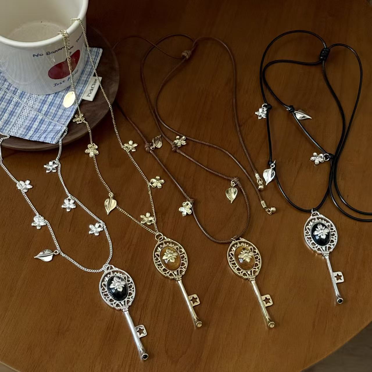 Sweet and Cool Casual Style Floral Key Pendant Necklace for Women, Niche Design Trendy Simple Long Sweater Chain Sweatshirt Chain