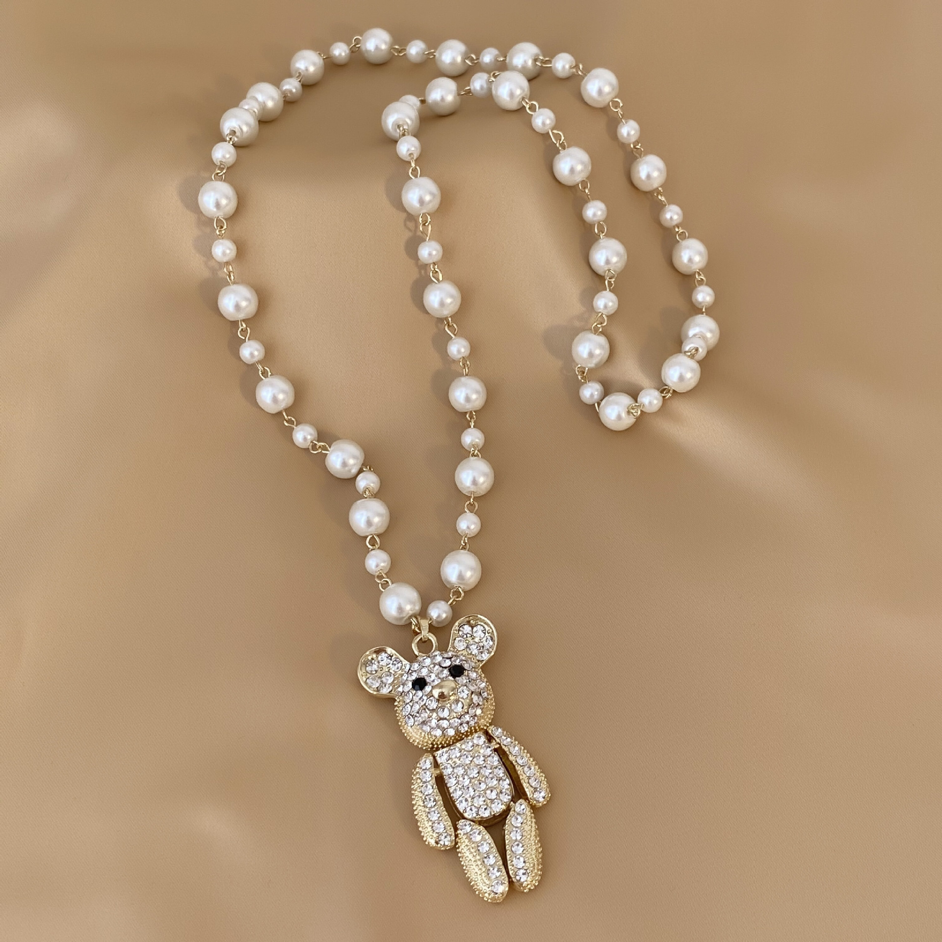 Korean full diamond joint bear pearl necklace Net red cute pendant clothes accessories sweater chain wholesale