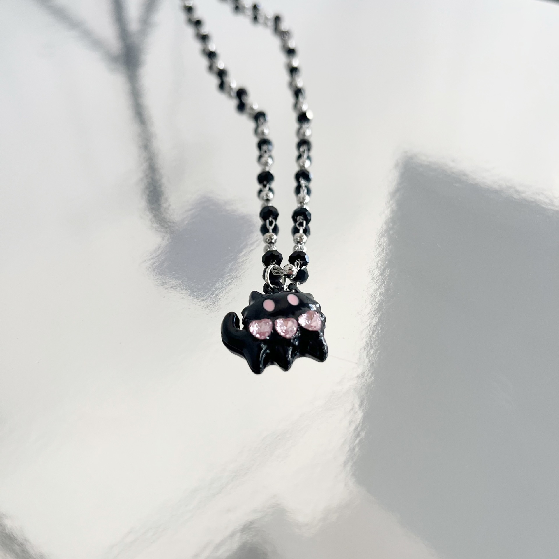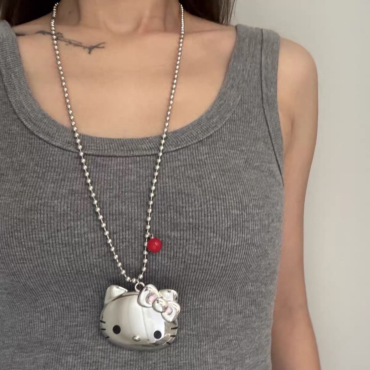 Cute Kitten Large Pendant Necklace Women's Long Round Bead Chain Sweater Chain Girly Style Versatile Sweatshirt Chain T-Shirt