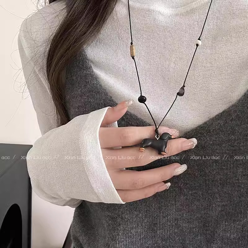 Childish Cute Natural Stone Dachshund Dog Black Rope Necklace Women's Autumn and Winter Long Niche Design All-match Sweatshirt Chain