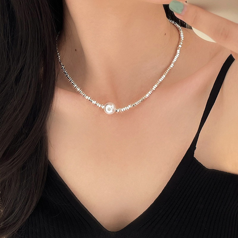 Broken Silver Pearl Necklace Women's Thick Edition Niche High-Level Design Sense Pendant Pearl Light Luxury Necklace Silver Clavicle Chain
