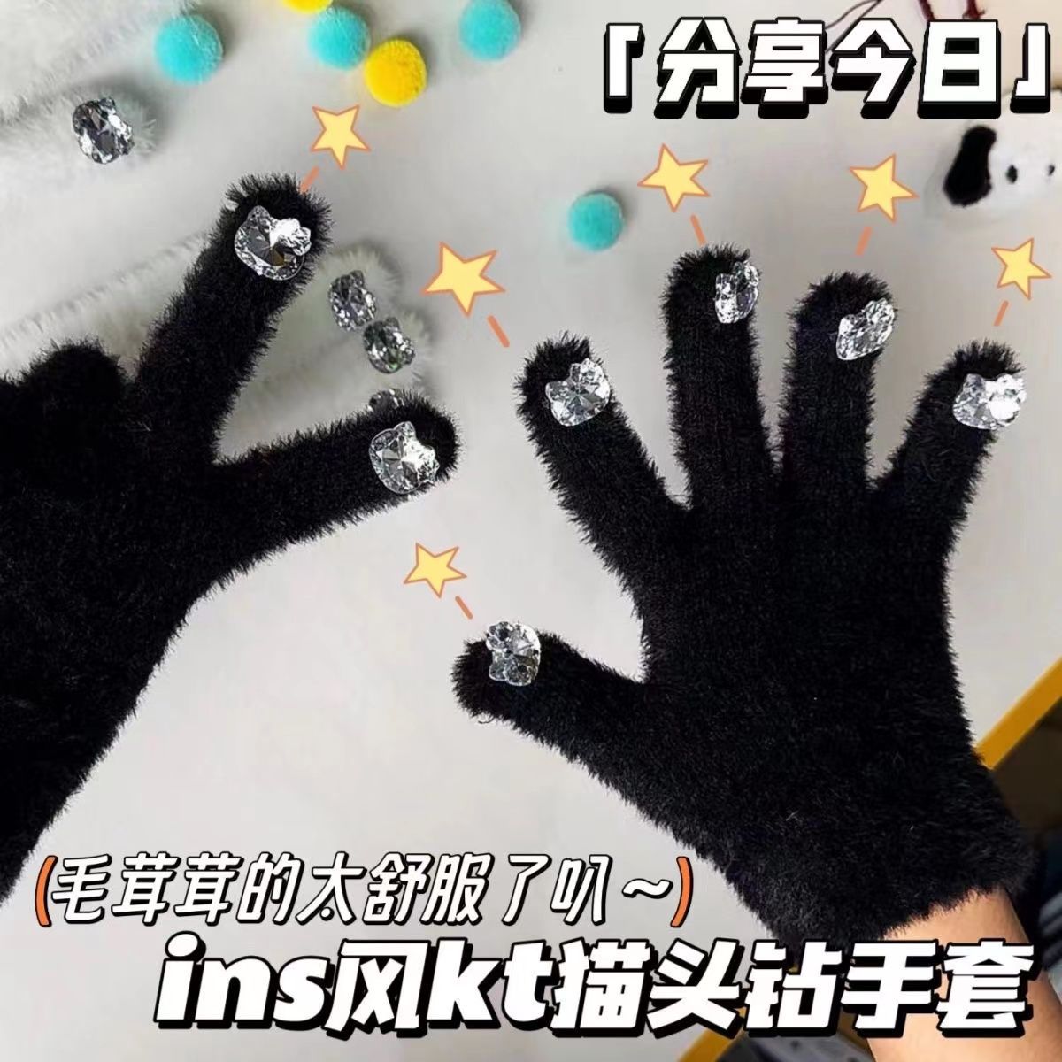 Factory wholesale Diamond mink fur gloves with diamond cat head Hello Kitty Winter warm cute riding five finger gloves