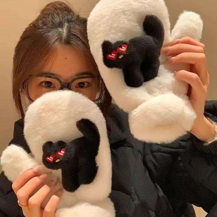 Cute Pink Cat Mittens Plush Gloves for Women 2024 Winter Thickeneded Fleece-Lined to Heattech and Cold-Proof Hanging Neck Cycling