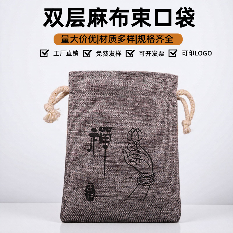 Dark Gray Thickened Double-Layer Linen Bag with Zen Character Drawstring Pocket for Buddhist Prayer Beads, Buddhist Bracelet, Folding Fan Bag, and Fleece-Lined Bag