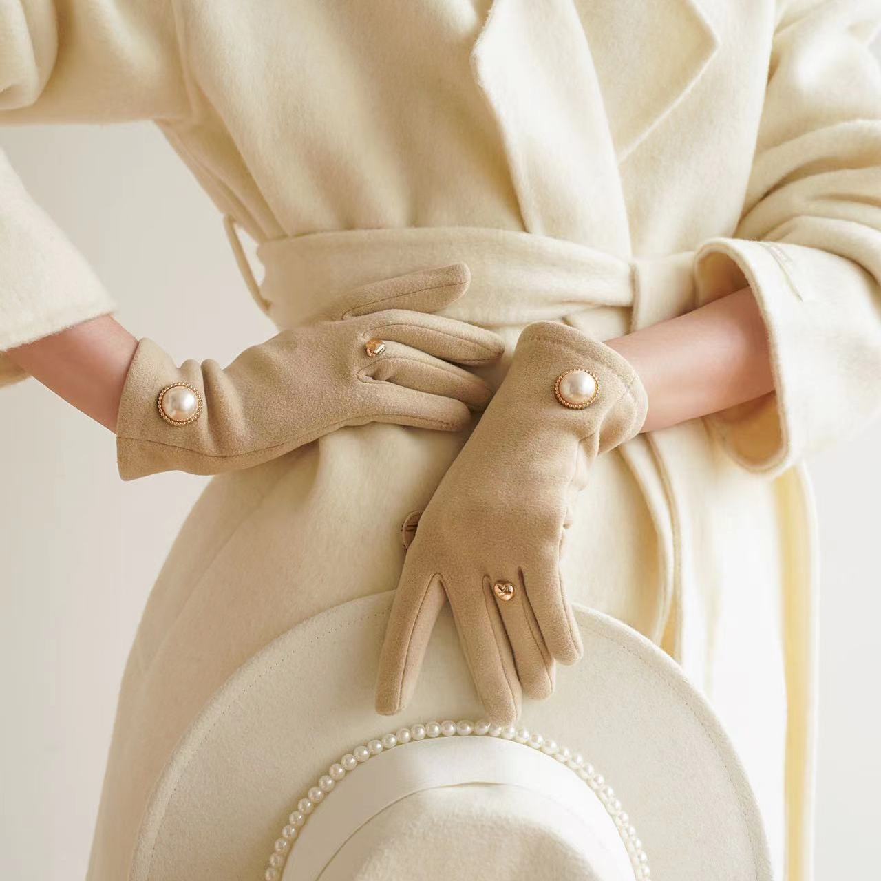 Autumn and Winter Five-Finger Gloves for Women, Pearl Ring, Touch Screen, Velvet, Versatile, Western Style, Korean Style, Factory Direct Sale
