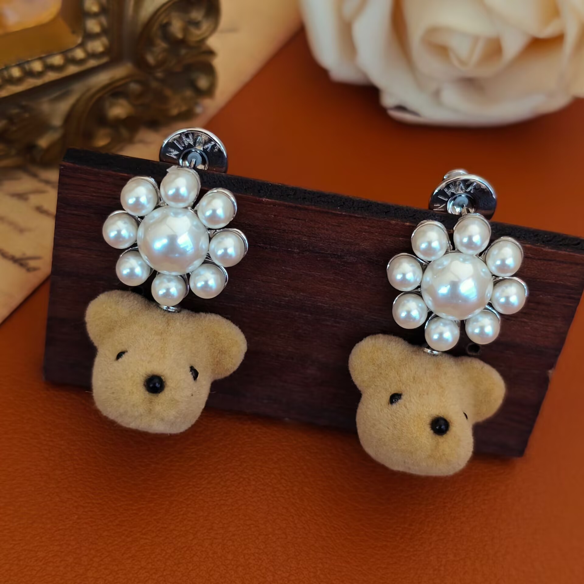 Brown Flocked Bear Pearl Earrings for Women 925 Silver Needle Cute Cartoon Sweet and Exquisite Furry Winter Earrings