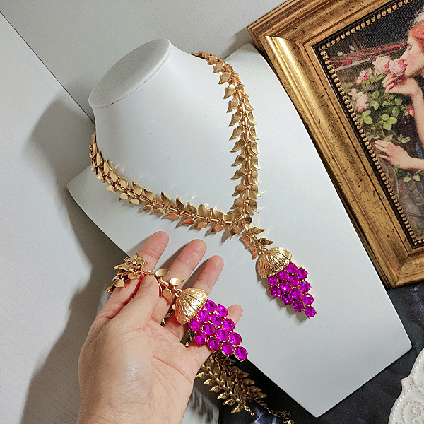 vintage Mid-ancient retro court rose pink gem grape pendant wheat ear plain gold necklace for women