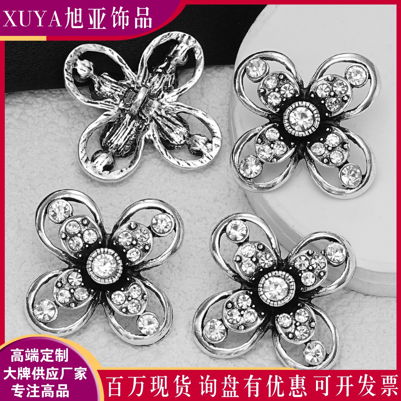 Retro Trendy Four-Leaf Petal-Shaped Diamond-Encrusted Alloy Button Tops, Outwears, Windbreakers, Suit Accessories and Decorative Pieces