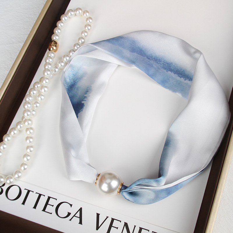 Design Sense Niche Temperament Magnetic Buckle Silk Scarf Korean Style Women's High-end Sense Fashionable Decorative Scarf Pearl Necklace