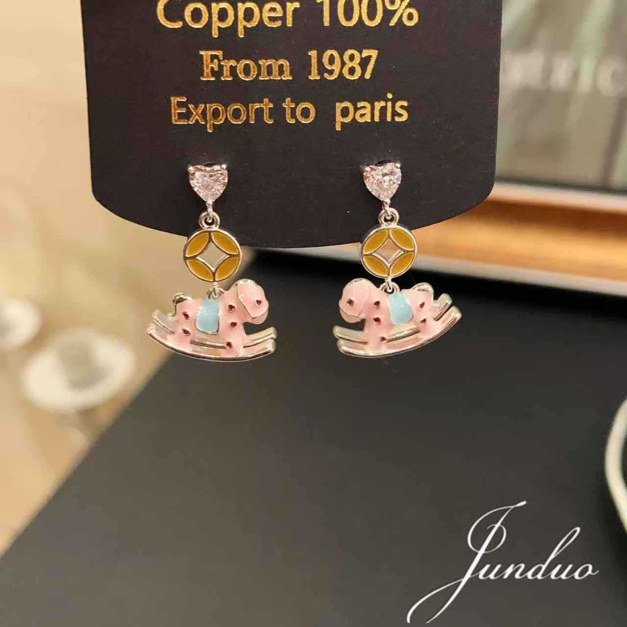 New Enamel Pony Earrings French Retro Micro-Paved Zircon Cute Versatile Light Luxury Earrings for Women Pink Pendant