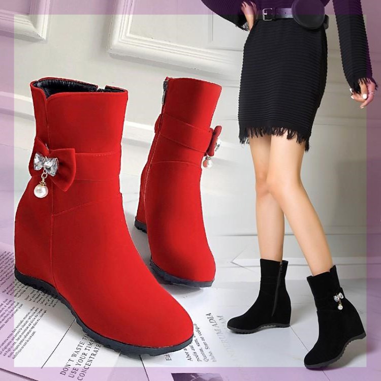 New 2020 Autumn and Winter Short Boots Women's Bow Pendant Cute Red Wedge Fleece Side Pull