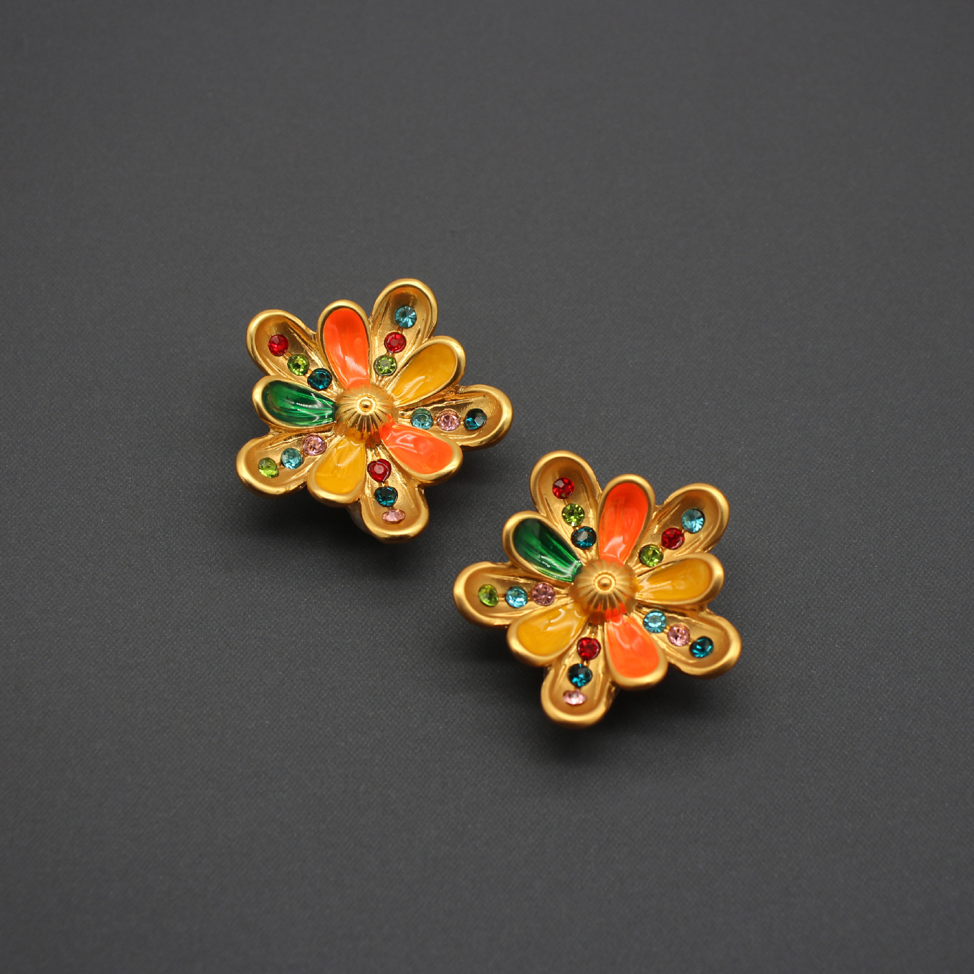 Treasure mid-ancient color enamel flower ear clip colorful gem warm thick feeling earrings without pierced ears