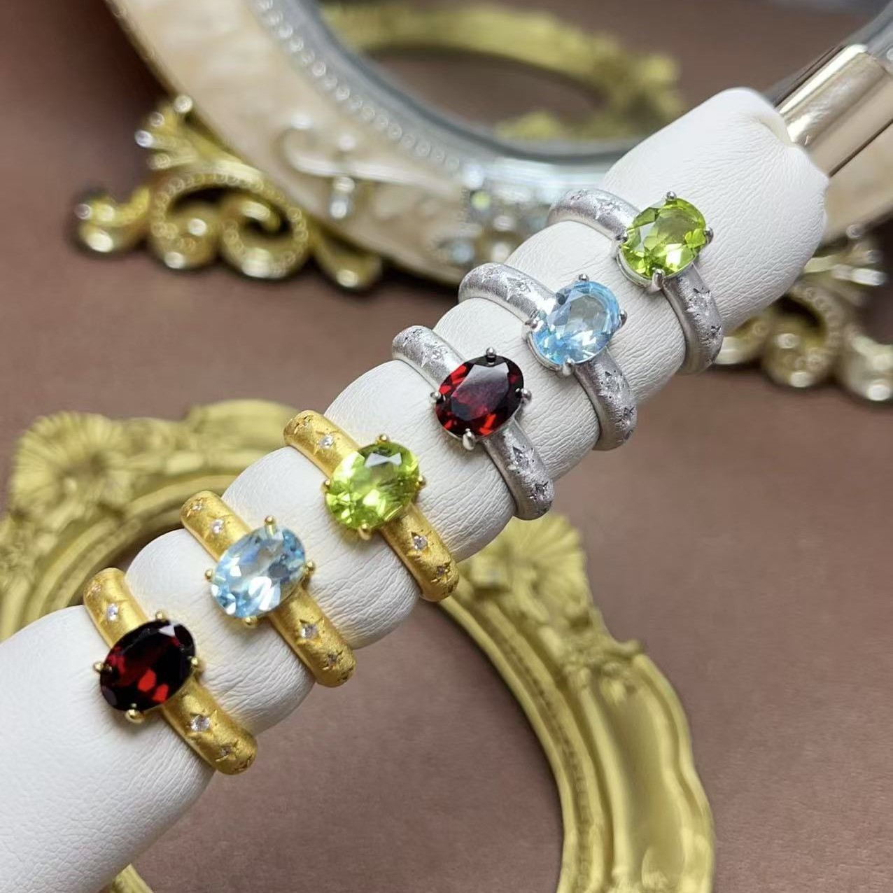 New Natural Garnet Peridot Topaz Ring 925 Silver Inlaid Wide Ring Arm Thick Style
