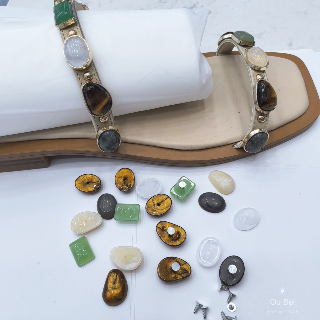 Inlaid Gemstone Women's Sandals with Shoe Buckles and Studs, Two-In-One Jade Shoelace Accessories with Studded Stones and Sheep's Eyes