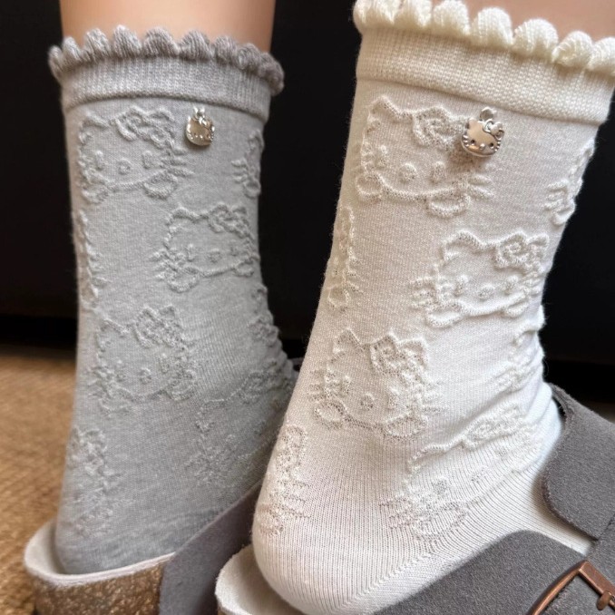 Cute Embossed Kt Cat Socks for Women with Bubble Mouth Lace Pile Stockings Cartoon Pendant Cotton Socks Spring and Autum Mid-Calf Socks