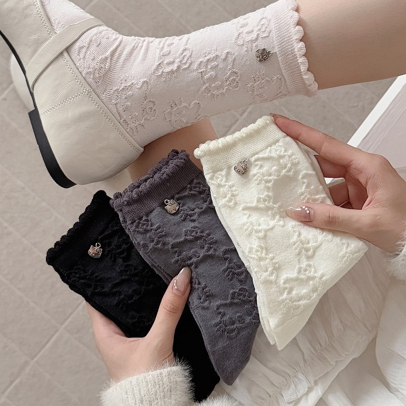 Autumn and Winter Women's Lace Slouch Socks with Cute Cat Pendants, Spring and Autumn Mid-Calf Socks, Seamless Sweet Ky Cat Socks