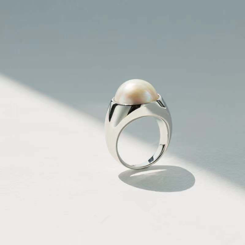 Titanium Steel Plated with 18K Gold European and American Minimalist Style White Pearl Shell Mother-Of-Pearl Designer Trendy Heavy Ring for Women