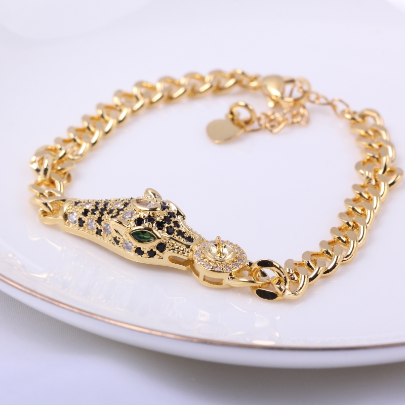 Copper Plated 18K Gold Zircon Leopard Head Green Eyes Pearl Thick Bracelet Bracelet Plus Long Chain DIY Accessories Europe and America