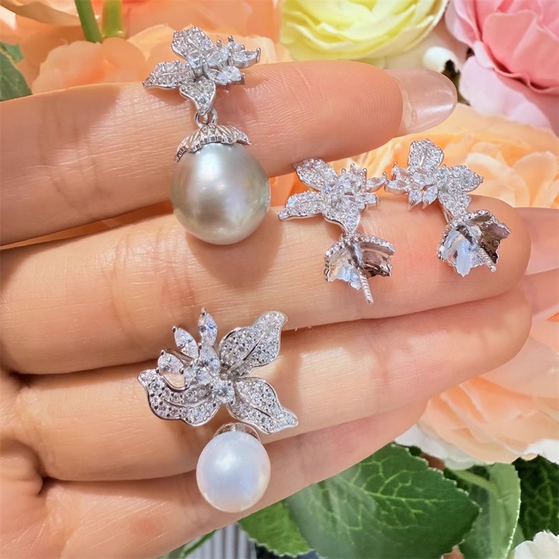 New Pearl Accessories S925 Sterling Silver Seiko Thick Version Inlaid with Zirconium Three-Petal Leaf Pendant Earrings Ring Empty Support Single Bead