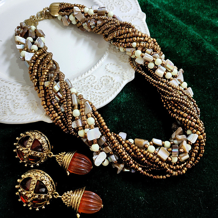 vintage Zhonggu heavy industry caramel glass beads shell multi-layer rice beads necklace tassel earrings for women