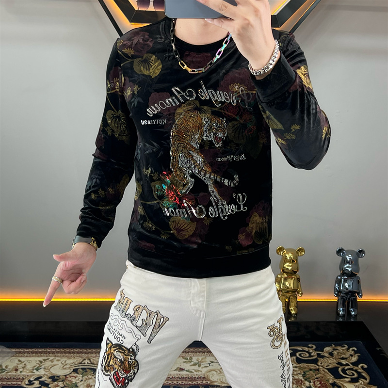 European Autumn New Diamond Velvet Long Men's Trendy Round Neck Sweater Fashion Slim Fit Men's Velvet Long Sleeve T-Shirt