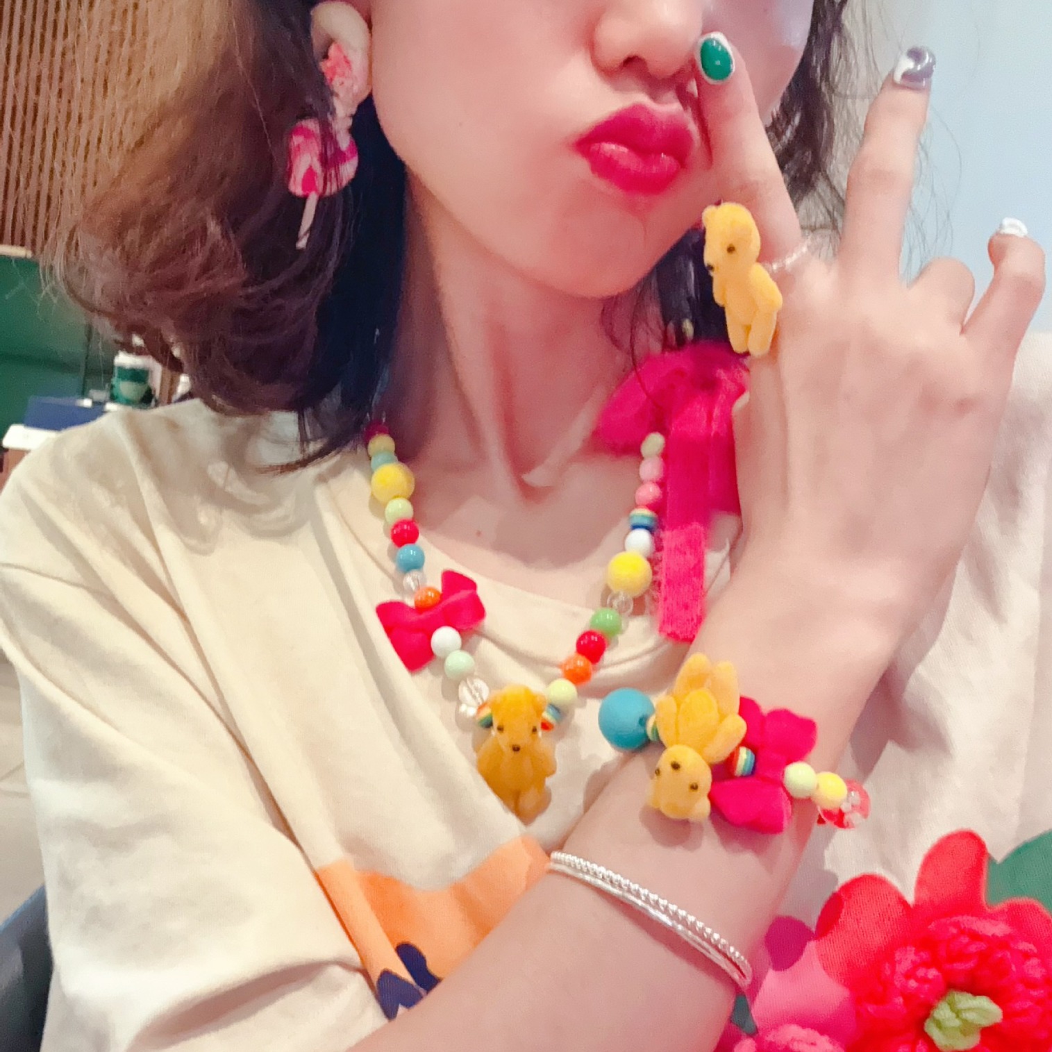 Niche Cute Girl Beaded Necklace Colorful Bracelet Childish Bear Pendant Flocking